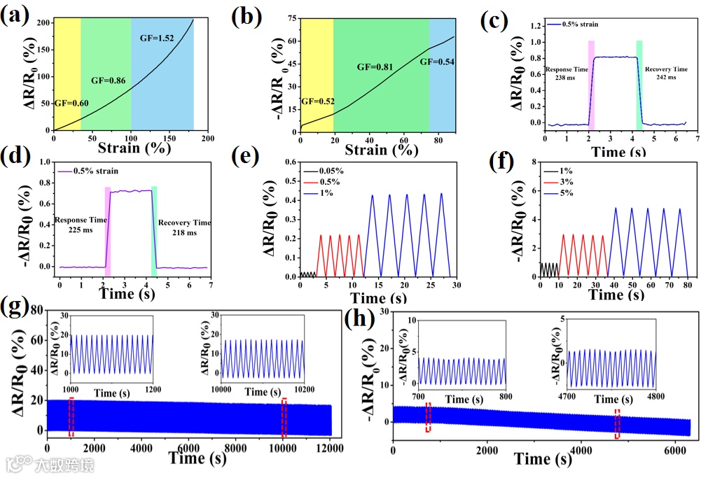 图5. 水凝胶的水下传感特性。a)拉伸和b)压缩过程中水凝胶GF的变化;c)拉伸和d)压缩的响应-恢复时间,e)拉伸和f)压缩过程中不同应变下的相对阻力变化;g)在30%应变下拉伸和h)在5%应变下压缩1000次循环的相对阻力变化。