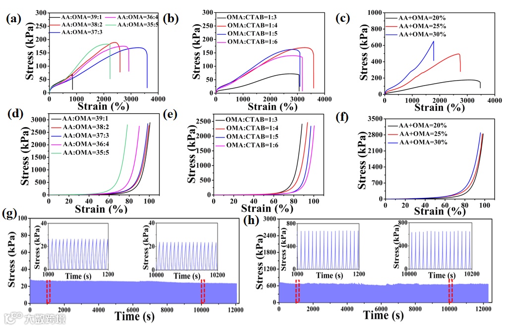 图4. 水凝胶的机械性能。不同a)亲水单体与疏水单体比例、b)CTAB与OMA比例和c)总单体含量的拉伸试验;不同d)亲水单体与疏水单体比例、e)CTAB与OMA比例和f)总单体含量的压缩试验;g)溶胀后在30%应变下对水凝胶进行1000次拉伸循环;h)溶胀后在50%应变下对水凝胶进行1000次压缩循环。
