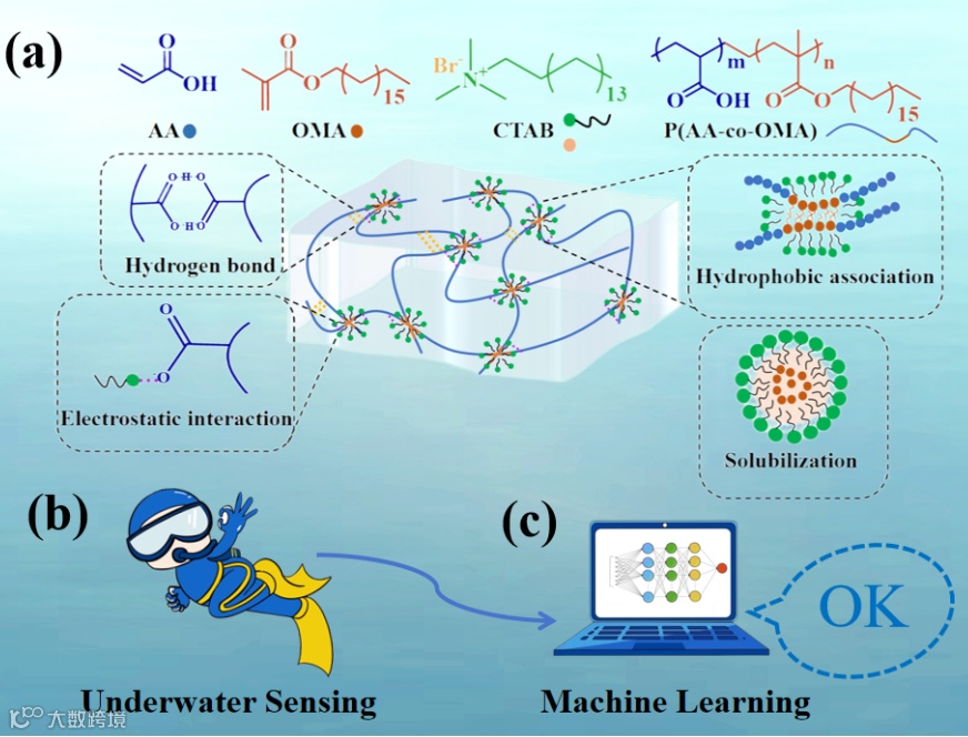 图1. a) 制备的水凝胶网络的结构示意图;b)水凝胶在水下传感器中的潜在应用;c)机器学习辅助水下手势识别。
