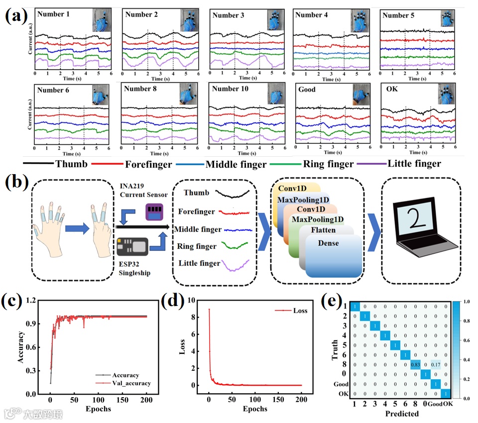 图6. 用于水下手势识别的水凝胶传感器。a)对应于不同手势的信号变化图;b)机器学习辅助手势识别流程图;c)识别十个手势的准确率曲线;d)识别十个手势的损失曲线;e)混淆矩阵。