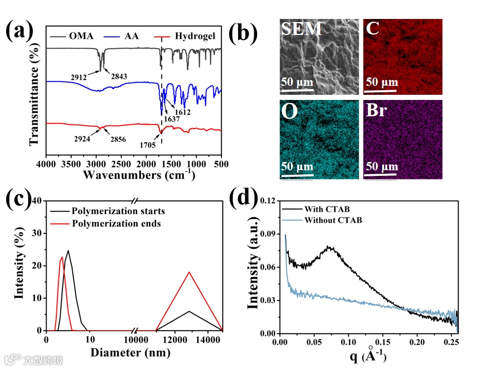 对P(AA-co-OMA)@CTAB水凝胶进行表征,通过傅里叶红外光谱确定自由基聚合的成功进行,证明P(AA-co-OMA)@CTAB水凝胶的成功合成。SEM和EDS图像证明了C和O构成了水凝胶的骨架,Br均匀分布在水凝胶网络结构之中。动态光散射和小角X射线散射证明了预聚液和形成的凝胶中均有胶束的存在。