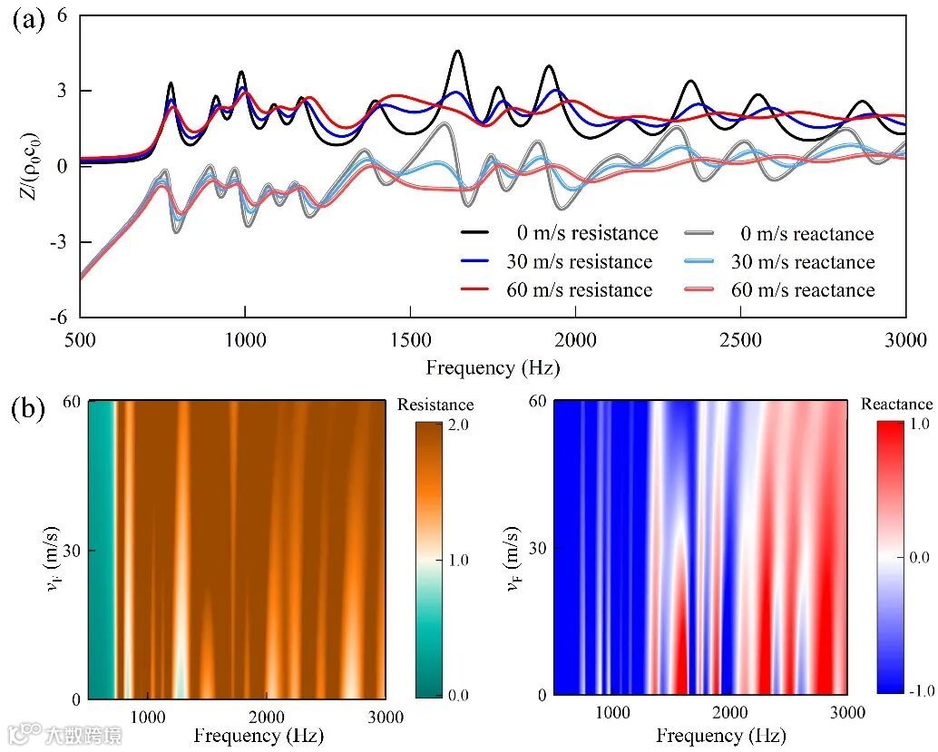 接着,论文通过3D打印制作出了尺寸为300 mm×50 mm×30 mm的超构声衬品,并在西北工业大学航空学院的流动管道噪声实验平台中进行了切向流声衰减实验,实验装置及验证结果如图6和图7所示。在无流动时,超构声衬在700~2700 Hz的平均吸收系数为0.85,500~3000 Hz的平均传递损失为9.7 dB,当流速为30和60 m/s时,700~2700 Hz的平均吸声系数分别为0.84和0.81,500~3000 Hz的平均传递损失分别为8.8和7.5 dB。随着流速的增加,传递损失在10 dB以上的频带逐渐变窄,但超构声衬整体上仍保持较高的声衰减性能。此外,论文还分析了不同流速下超构声衬的计算声阻抗,如图8所示,结果表明超构声衬具有对不同流速的良好适应性。