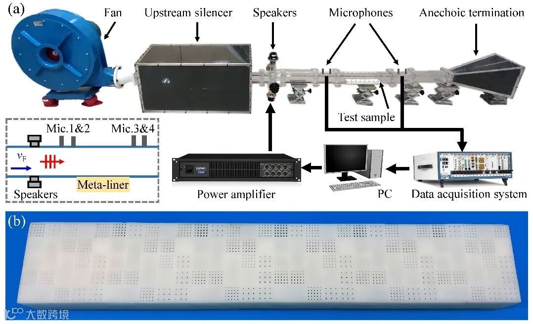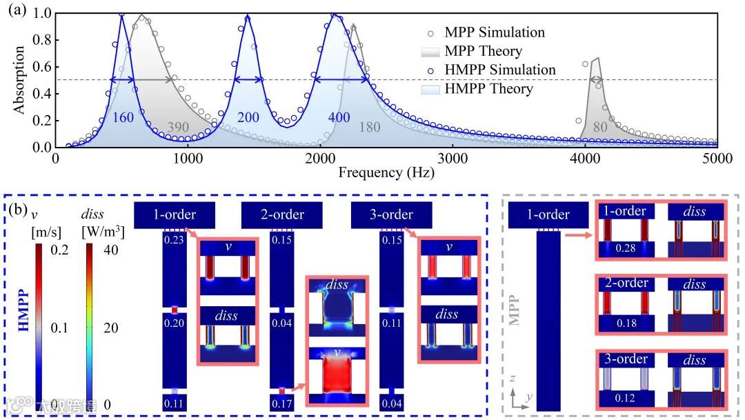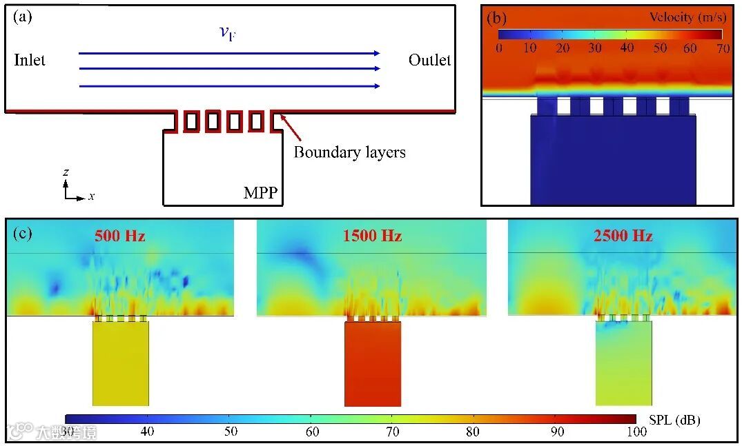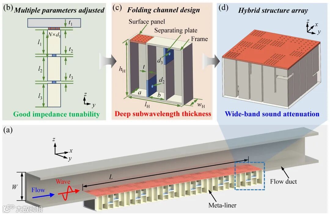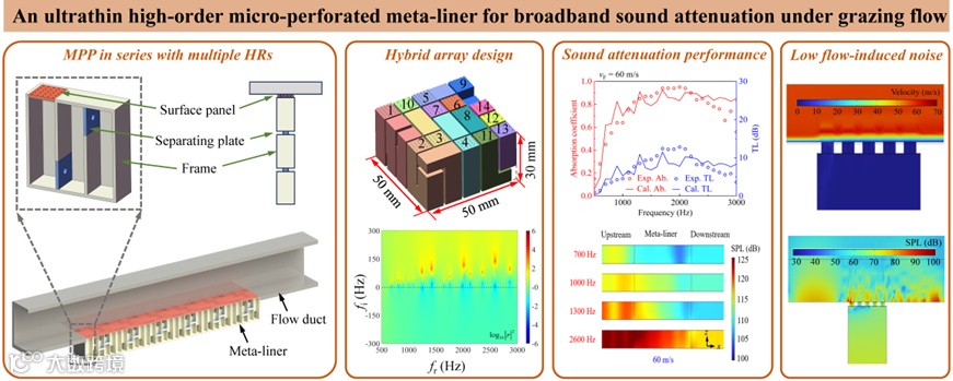 西安交通大学机械工程学院马富银教授课题组和西北工业大学航空学院周杰教授合作,提出了一种微穿孔板(MPP)与多个亥姆霍兹共振腔(HR)结合的超薄高阶微穿孔板(HMPP)超构声衬,实现了切向流作用下的宽带声衰减。针对声衬吸声带宽与结构厚度之间的局限,单胞结构参数的可调节性以及单胞阵列的非局部强耦合可以为宽带吸声设计提供良好的阻抗调谐条件,而HR的折叠通道也给声衬的超薄设计带来了更多空间。针对切向流对结构吸声的影响,建立了考虑流动的超构声衬等效阻抗理论模型,并通过数值模拟与流管实验成功预测了超构声衬在切向流作用下的传递损失和吸声特性。此外,MPP的细小开孔设计也有效抑制了声衬表面孔洞可能形成的啸叫声。HMPP超构声衬具有宽带声衰减性能、深亚波长厚度和对不同流速的良好适应性,在航空发动机、流动管道的噪声控制及相关工程领域具有广阔的应用前景。