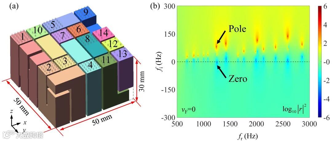 论文通过阻抗调制设计,进一步设计了多个HMMP单胞组成的多阶混合HMPP阵列,如图5所示。混合阵列由14个HMPP单胞组成,长宽均为50 mm,厚度为30 mm。通过反射系数的复平面分析,HMPP阵列反射系数的大部分零点落在实频率轴上,证明在谐振频率上完成了准完美的声能吸收。且随着频率的增加,泄漏率逐渐增加,因此吸收峰也逐渐变宽。在多阶混合HMPP阵列的基础上,沿x方向排列6个阵列即可得到长度L=300 mm的超薄HMPP超构声衬。