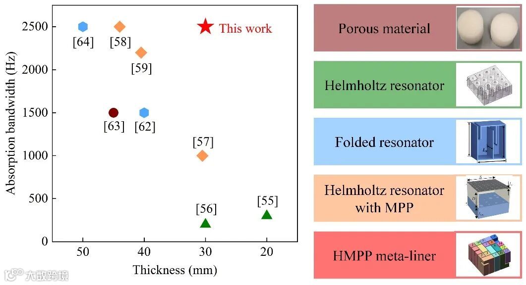 最后,论文将HMPP超构声衬与其他超构声衬进行了对比,如图10所示。单纯靠HR进行吸声的超构声衬虽然厚度小,但HR自身结构的限制导致其工作频带较为狭窄;MPP超构声衬与折叠谐振腔超构声衬有效拓宽了吸声频带,但同时也带来了结构厚度的增加。与以上超构声衬相比,HMPP超构声衬同时集成了MPP的宽带吸收和HR的低频吸收的优点,大大拓宽了吸声频带,且折叠腔体设计使结构具有深亚波长厚度。与相同吸声带宽的声衬相比,HMPP超构声衬的厚度降低了1/3以上;与相同厚度的声衬相比,HMPP的吸声带宽拓宽了2.5倍以上。综上,HMPP超构声衬在吸声带宽与结构厚度的协调统一上具有显著的优势。