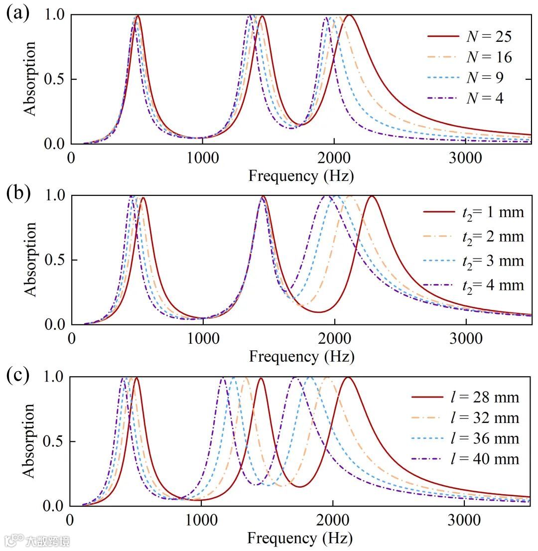 论文进一步分析了三阶HMPP单胞的静态吸收性能以及不同结构参数对吸收性能的影响,如图3和图4所示。MPP单胞在低于4500 Hz的频带中具有三个吸收峰,但高阶峰值从100%逐渐降低到60%。而三阶HMPP单胞在2500 Hz以下实现了三个近乎完美的吸收峰,这显著增强了500~3000 Hz范围内的吸收性能,使其更适合于针对航空发动机短舱声衬等应用的工作频率的降噪设计,且三个吸收峰的50%吸收带宽也相较于传统MPP单胞更宽,说明通过引入两个分离板结合额外的设计参数,两个更高阶的峰值表现出更宽的带宽,进一步改善了结构的整体吸收性能。在三阶HMPP单胞中,二阶峰处的第三层孔和三阶峰处的第二层孔都起到增强局域能量耗散的作用,并与第一层微穿孔协同工作,共同展宽二阶和三阶的吸收峰。