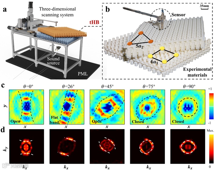 图3|异质双层超表面的实验观察。a,用于测量异质双层超表面的声学实验装置示意图。b, 3D打印的声学超表面。c-d, 不同扭转角度下测量的声场及其对应的FFT。