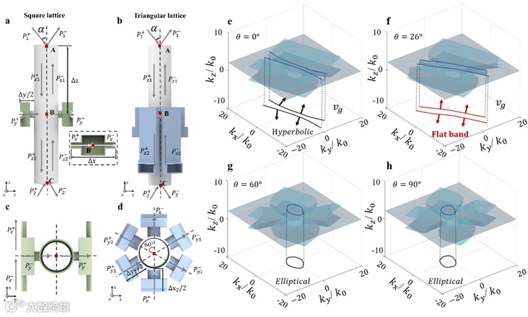 图2|异质双层超表面的理论模型。a-d, 正方形晶格和三角形晶格的主视图以及俯视图。e-h, 在激发频率f=1880Hz下,扭转角分别为θ=0°, 26°, 45°, 75°和 90°时的等频线。