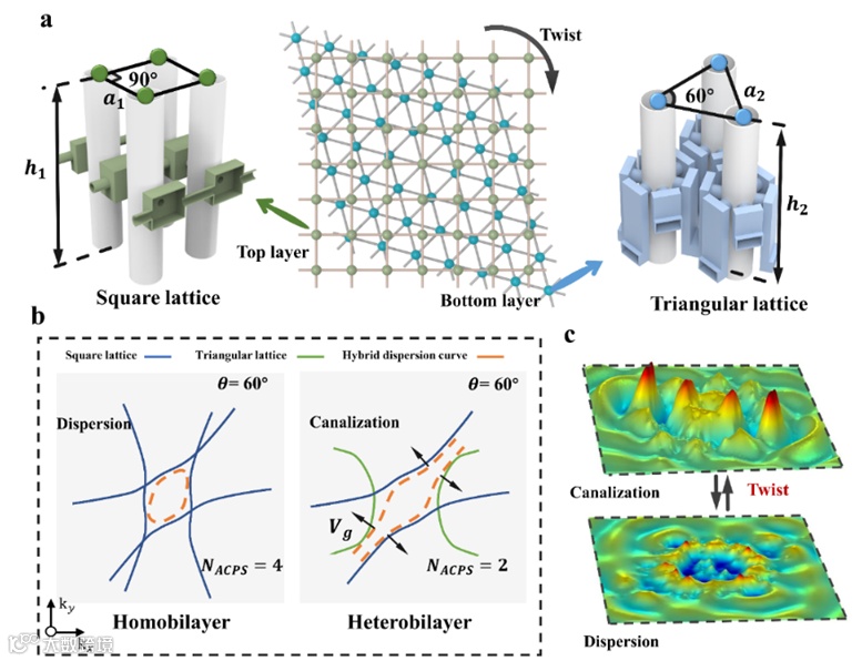图1|异质双层系统的双曲表面极化。a, 正方形和三角形晶格的示意图、异质双层结构的概念图。b, 同质双层和异质双层的色散曲线杂化图。c, 双曲和椭圆模式之间声场模式的三维可视化。