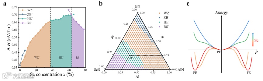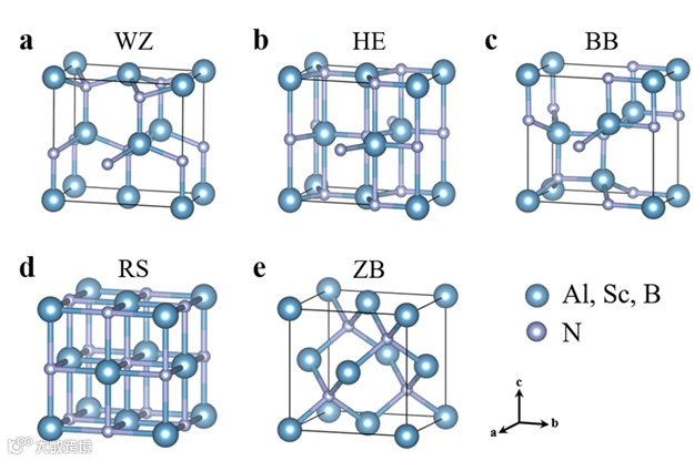 本研究系统性地考察了纤锌矿(WZ)、六方(HE)、岩盐(RS)、闪锌矿(ZB)以及β-BeO结构(BB)五种典型晶格结构(见图3)在(Al,Sc,B)N合金体系中的稳定性与转变路径。由于块体WZ-AlN极化状态稳定且难以在电场下发生翻转,研究发现顺电性的HE与BB结构在极化翻转过程中可作为中间态,成为实现可切换极化结构的重要调控手段。进一步分析表明,仅靠单一掺杂Sc或B元素不足以稳定HE或BB基态,因此本工作首次引入三元阳离子调控策略,旨在实现多晶格结构之间的精确转换,为高性能铁电材料的设计提供了新思路。