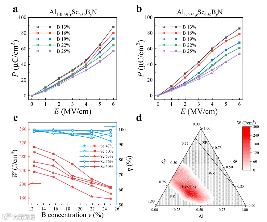 图5 (Al,Sc,B)N体系的P-E曲线和储能性能