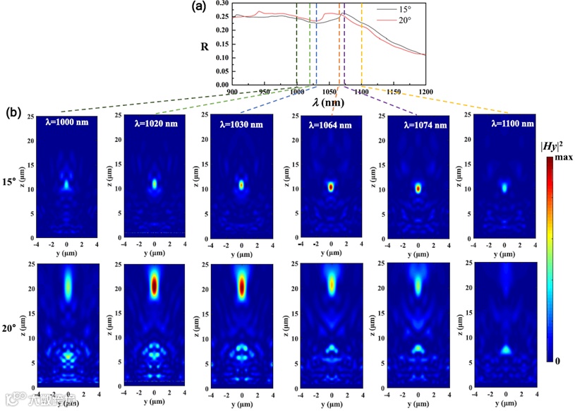 图3 工作波长1064 nm附近的聚焦效果分析。(a) 在15°和20°入射角下宽带(900-1200 nm)的光谱反射率。(b)不同波长下 y-z 平面聚焦远场图。