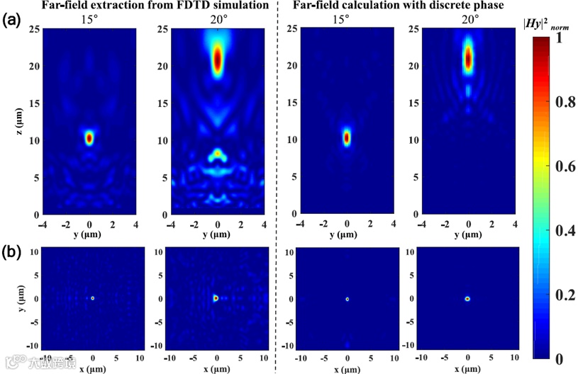 图2 角度变焦超构透镜在15°和20°入射角度下的仿真结果。(a) FDTD模拟和远场计算的y-z面磁场强度图。(b) FDTD模拟和远场计算的 x-y面磁场强度图。