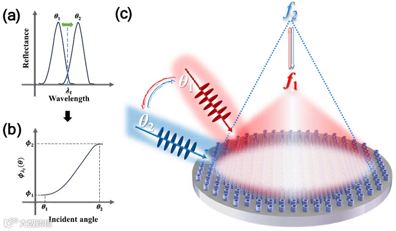 图1 原理概念图(a)不同入射角下米氏谐振的频移示意图。(b)角度诱导的频移而导致附近波长的相位变化示意图。(c) 通过米氏谐振获得不同局部相位和角度色散来实现入射角调焦。
