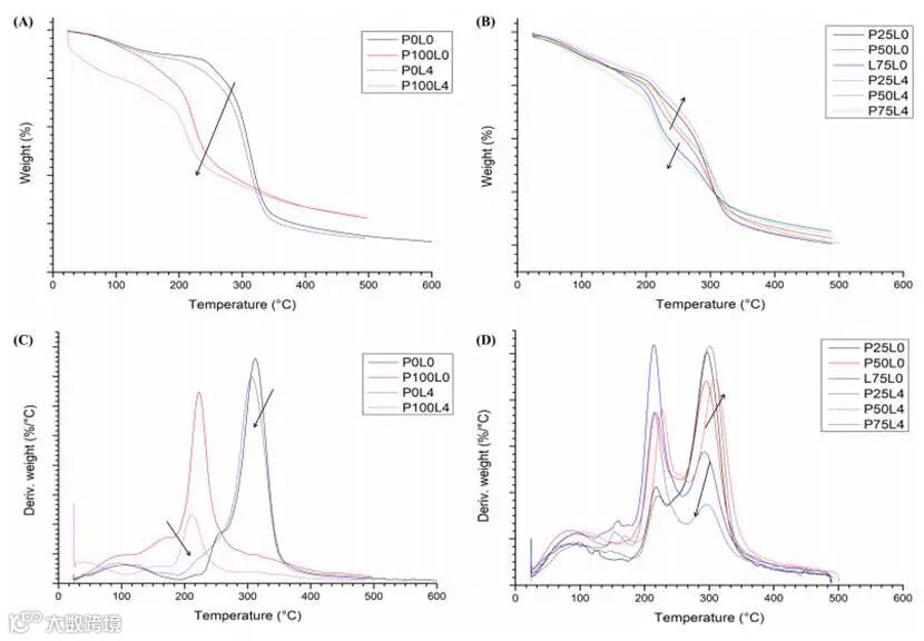 用单独的热聚性果胶或热聚性淀粉制备的薄膜具有三个降解峰,而共混物显示四个降解阶段,木质素微粒的加入降低了单独的热聚性果胶或热聚性淀粉薄膜的质量损失。当添加木质素微粒时,由芳香化合物的存在,观察到共混物最大降解温度升高,提高热稳定性。 |