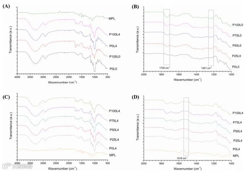 在3287 cm−1(OH拉伸振动)、2924 cm−1(硬脂酸和亚甲基的CH拉伸以及果胶链的甲基)、1649 cm−1(氢键)以及925 cm−1和1149 cm−1(α1,4糖苷键)处观察到谱带。在1076 cm−1(糖结构的C-O-C伸缩振动,葡萄糖吡喃环),1016 cm−1(C-OH伸缩),1410 cm−1(甘油特征)和1739 cm−1和1201 cm−1处观察到其他常见条带,对应于硬脂酸和柠檬酸以及果胶的酯键。在对应于果胶酯基的1725 cm-1和1201 cm-1处观察到谱带强度略有变化,共混物中在1519 cm−1处出现一个峰值,是来自木质素微粒的芳香化合物。 |