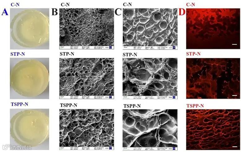 图2 STP和TSPP处理后凝胶的表面形态和蛋清凝胶的微观结构变化:外形特征(A);800倍扫描电镜下的结果(B);在3000倍下的结果(C);D20倍的荧光显微结构(D);比例尺为100微米