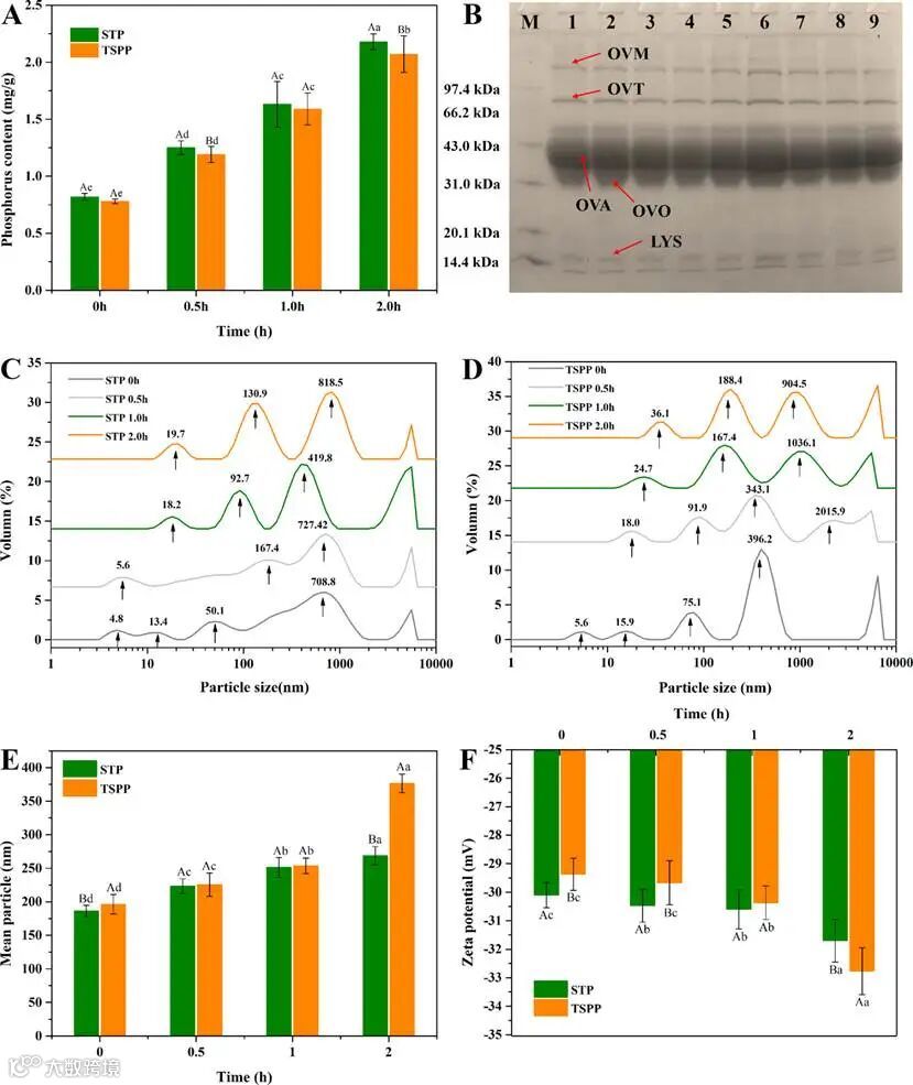 原蛋清蛋白和不同程度磷酸化蛋白磷酸化磷含量粒径分布(A)天然蛋清蛋白和磷酸化蛋白的SDS-PAGE蛋白图谱(B)、磷酸化后的蛋清蛋白粒径分布,平均粒径和zeta电势如图1C、1D和1E所示。结果表明随着时间推移,磷酸化程度提高;随着反应的进行,小粒径弥散峰逐渐消失,粒径增大。TSPP和STP组在1-2 h后小峰消失,出现4个相似的峰,说明蛋白聚集物形成并逐渐稳定。磷酸化程度增加,表面负载电荷的绝对值提高(图1F),这也表明EW聚集体逐渐变得更加稳定;蛋白质的表面疏水性随磷酸化时间显著增加,说明EWP中隐藏的疏水基暴露,疏水基含量增加。利用FT-IR对其二级结构分析可知,磷酸化作用降低了EWG的三重螺旋含量,磷酸化降低了蛋清凝胶的的随机结构和α-螺旋结构,增加了β-折叠和β-转角的含量。同时,添加磷酸盐影响了蛋白质的聚集特性。