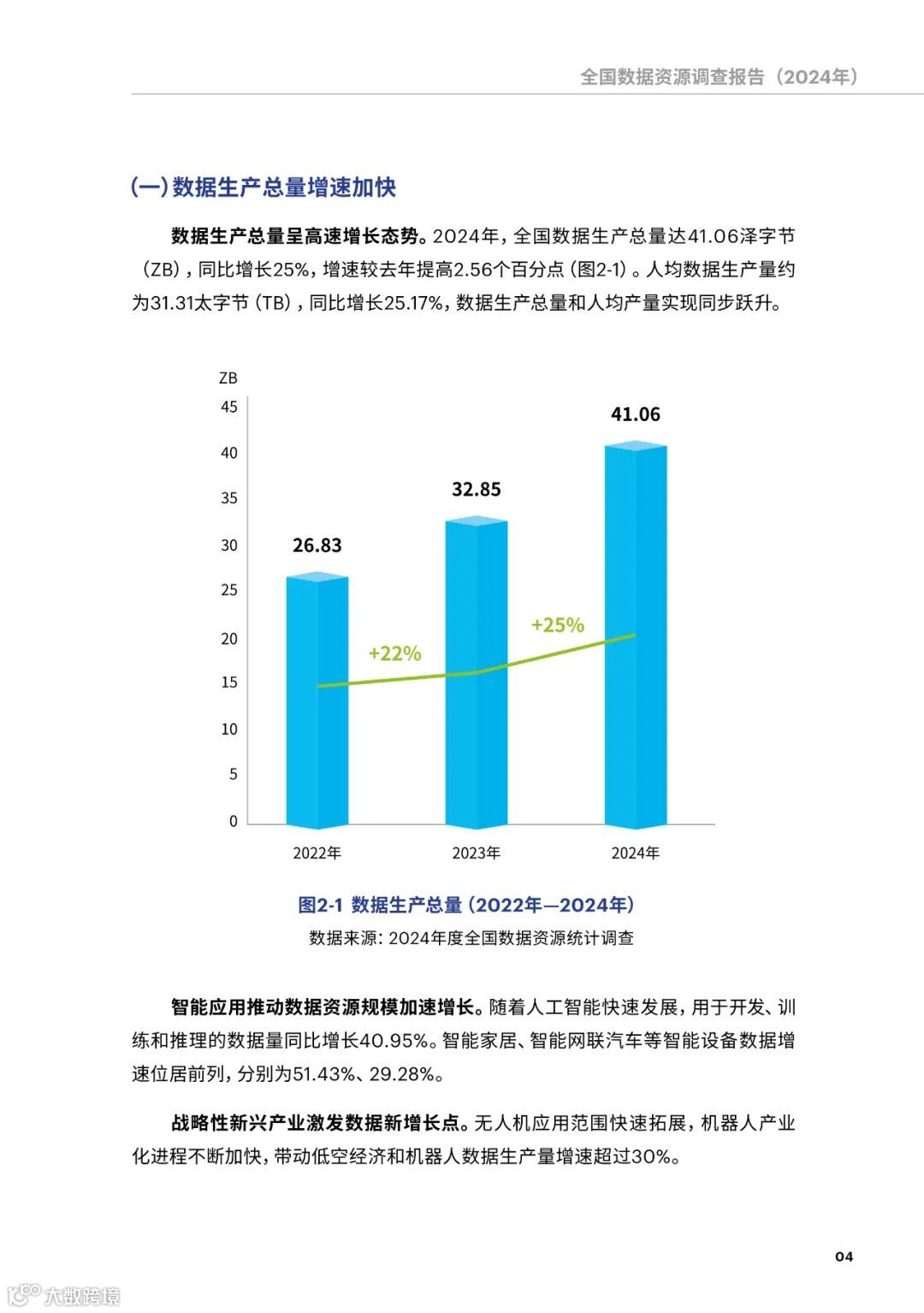 一是数据资源规模加速增长。2024年,全国数据生产量达41.06泽字节(ZB),同比增长25%。智能家居、智能网联汽车、无人机等智能设备数据增速位居前列。