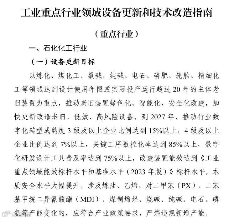 为贯彻落实党中央、国务院决策部署,加强对推动工业领域设备更新和技术改造工作的指导,依据《大规模设备更新和消费品以旧换新行动方案》和《推动工业领域设备更新实施方案》,工业和信息化部组织编制了《工业重点行业领域设备更新和技术改造指南》,现印发给你们,请结合实际推动实施。