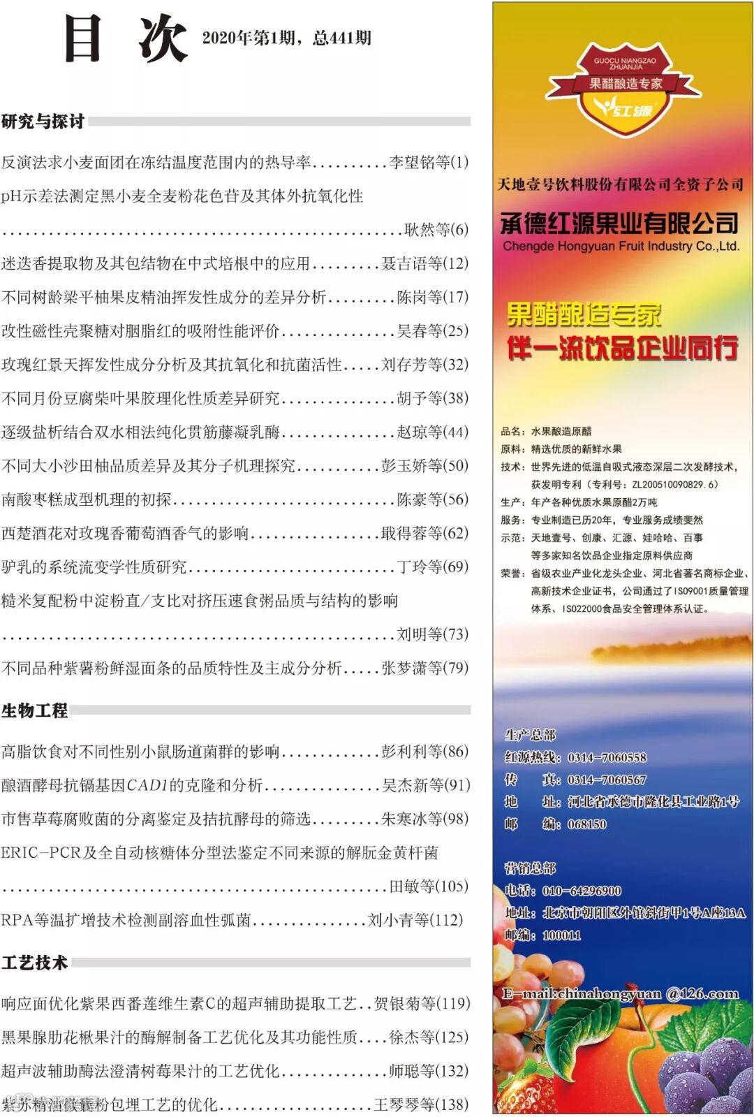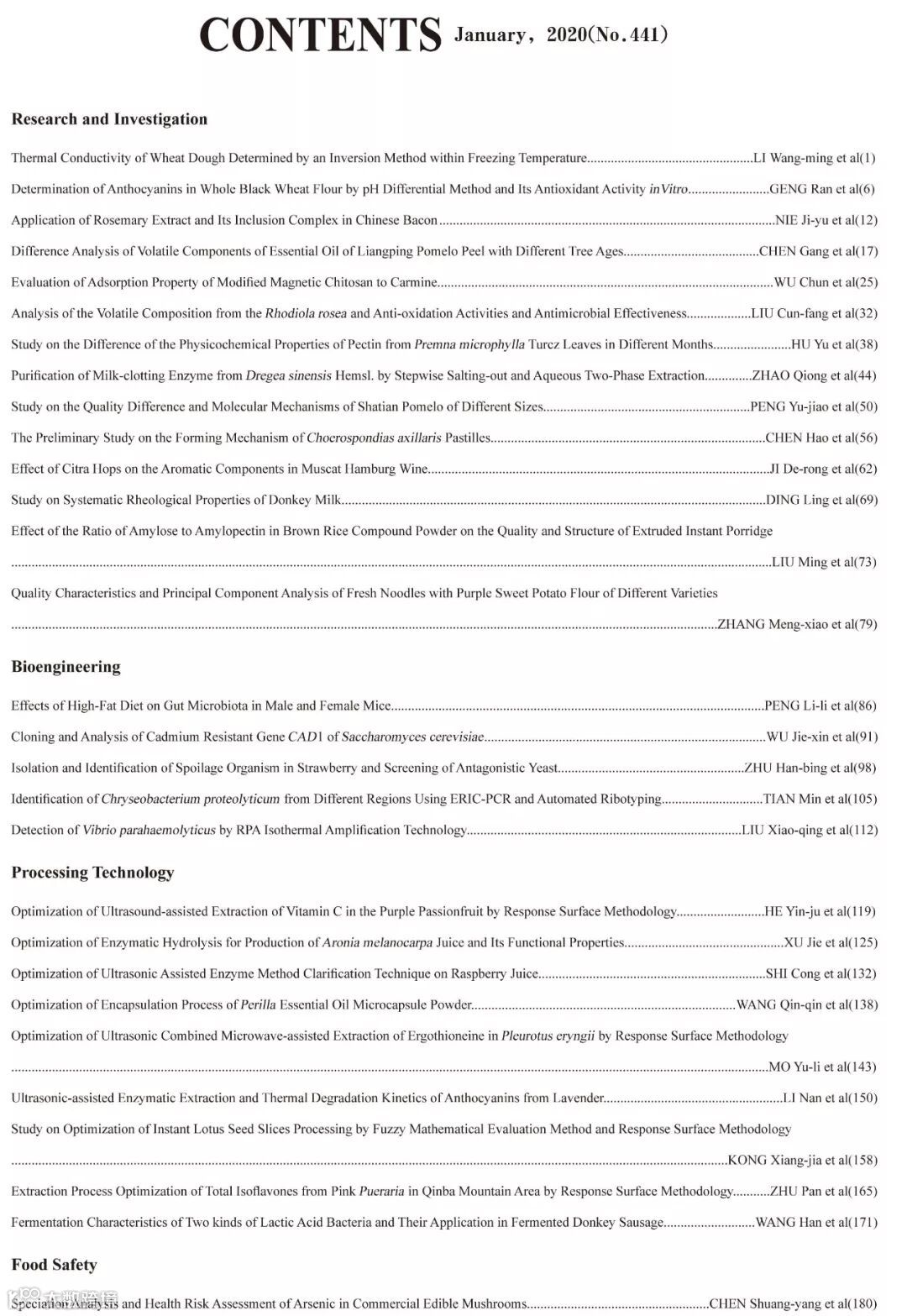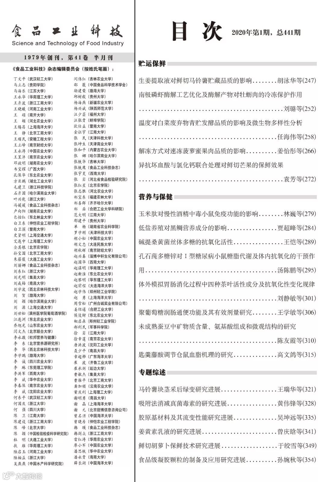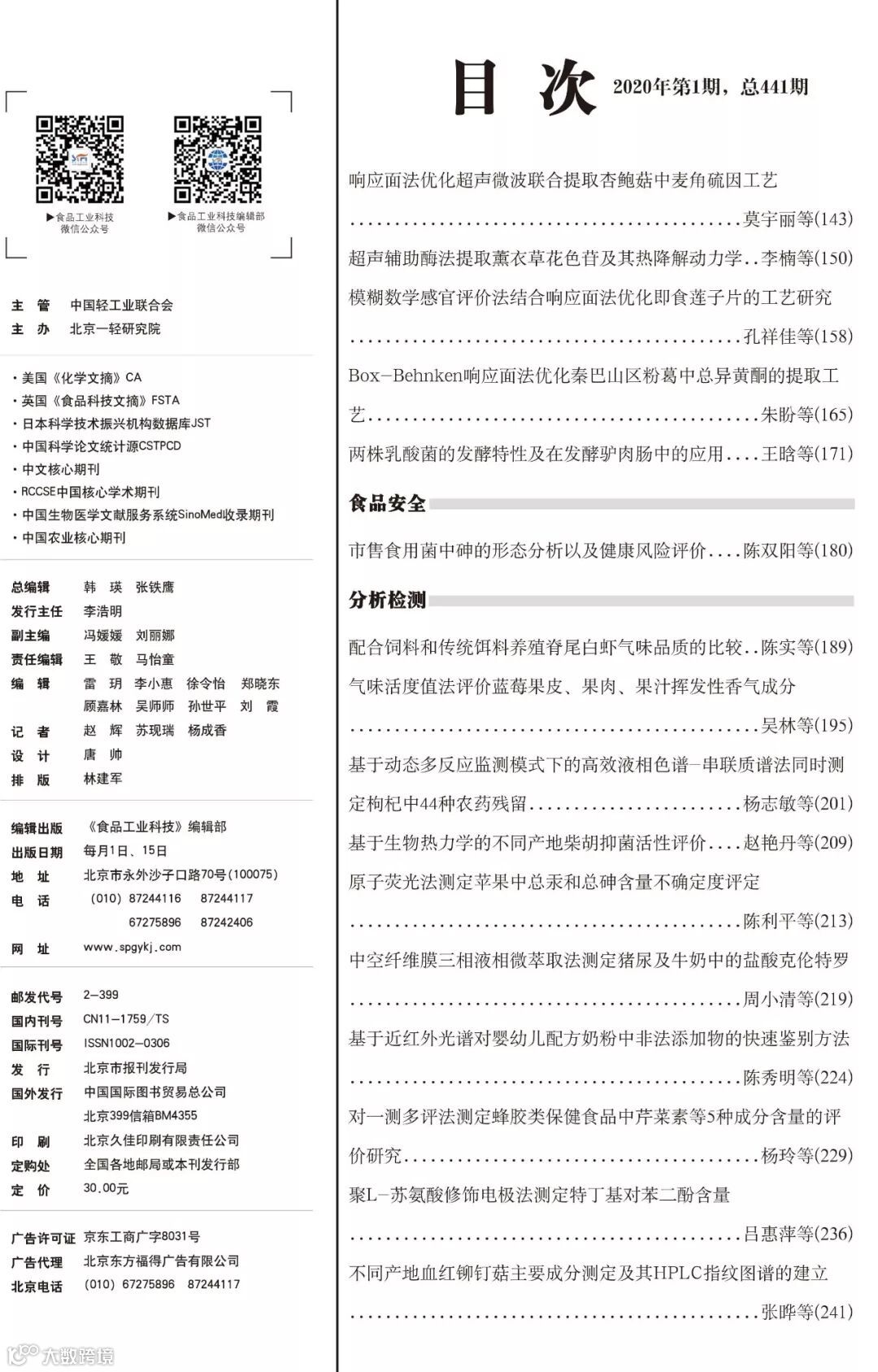 《食品工业科技》2020年1期封面及目次