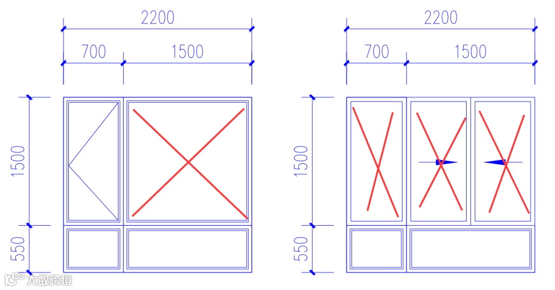 以该图卧室窗为例,同样尺寸下,左侧设置平开窗、右侧设置推拉窗,平开窗的窗框数量少于推拉窗,玻璃面积规整,有利于室内对室外的视线通透