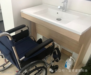 洗手盆洗手槽根据人体工程学,在靠近人的一侧把边槽尺寸做到60~70,便于抓握,洗手的过程身体前倾,可能会造成轮椅滑动,洗手盆内侧的适度尺寸作为辅助抓手,便于老人控制身体的跟轮椅的稳定。