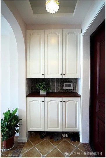 如下图鞋柜没有助力抓手,底部设置的缝隙较深,如果老人将鞋子踢进去之后,需要弯腰俯身去寻找,这对老人来说是一个比较危险的动作。如果选择此类型的鞋柜应在下部空隙处加一个挡板,使鞋子能漏半各在外侧。且上部设置适当抓手。