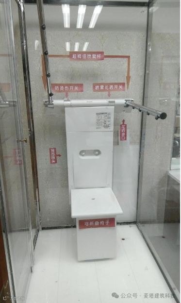 卫生间:洗浴间根据老人的具体情况,建议选择设计固定式坐浴,两侧助力杆可以设置上下活动形式,杆件上设置防滑钉。坐着洗澡更安全,且洗完之后地面比较滑,两侧的抓杆可以增加安全系数。