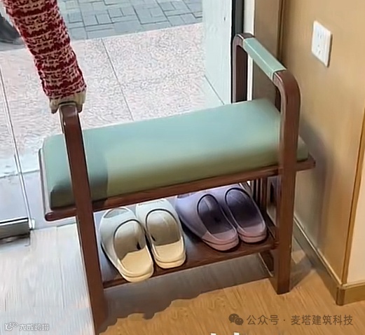 也可以在老年鞋柜边设置一个鞋凳,方便坐下换鞋的同时,两侧的把手有助于辅助支撑老年起身的作用。