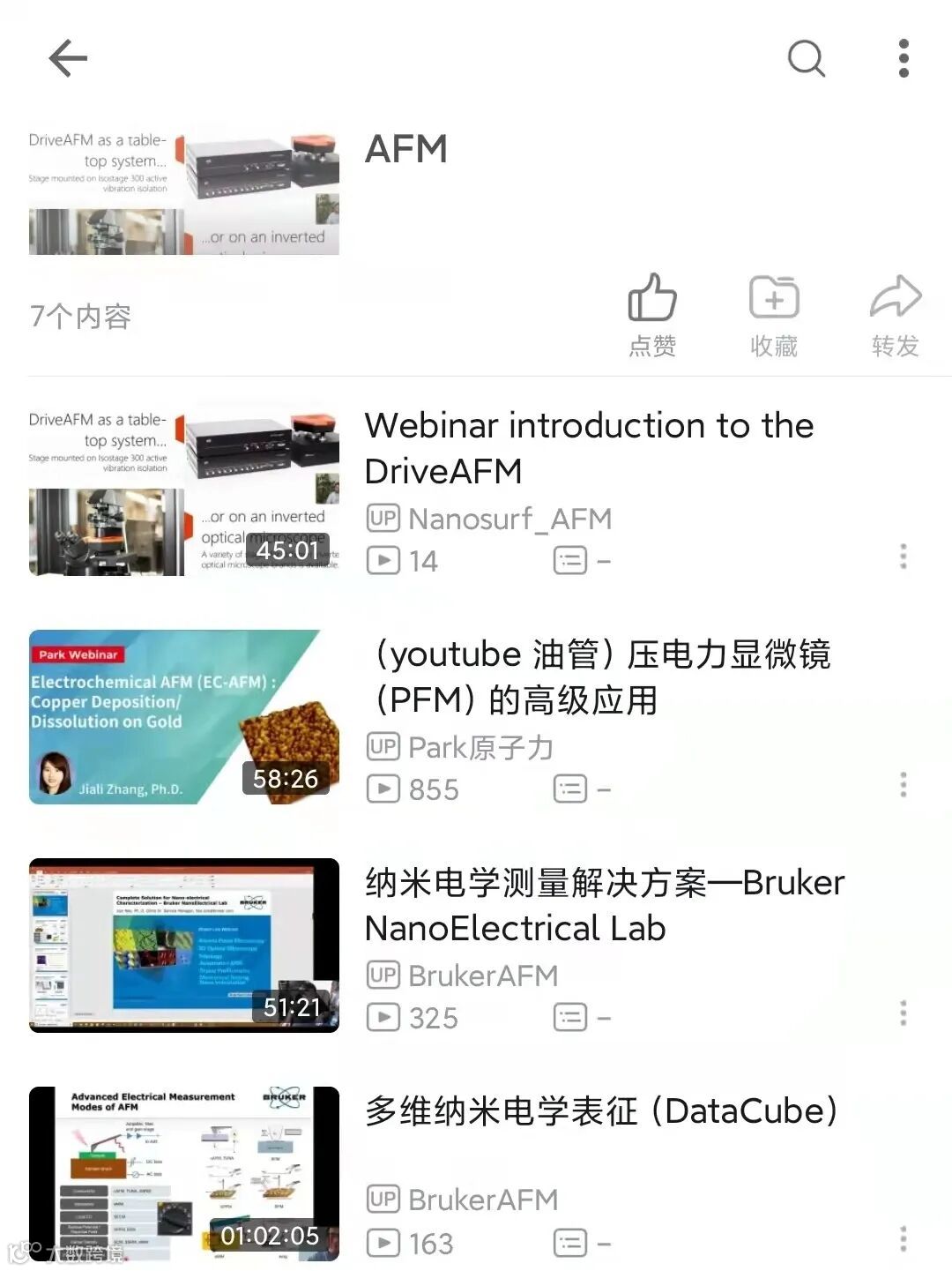 “方法上,有一点很重要,要善于寻找和利用优质公开资源。譬如说MOOC平台Coursera,edX,国内的蔻享(Koushare),甚至B站等,都有非常优质的系统性的资源。”说着,王胜打开了自己的B站主页,收藏夹中原子力显微镜(AFM)的培训视频映入眼帘。