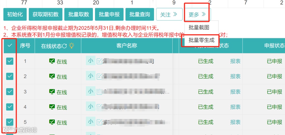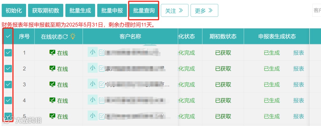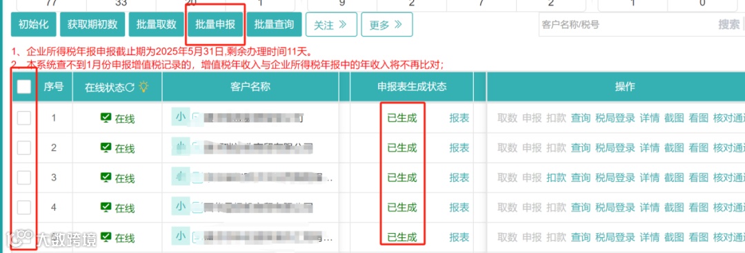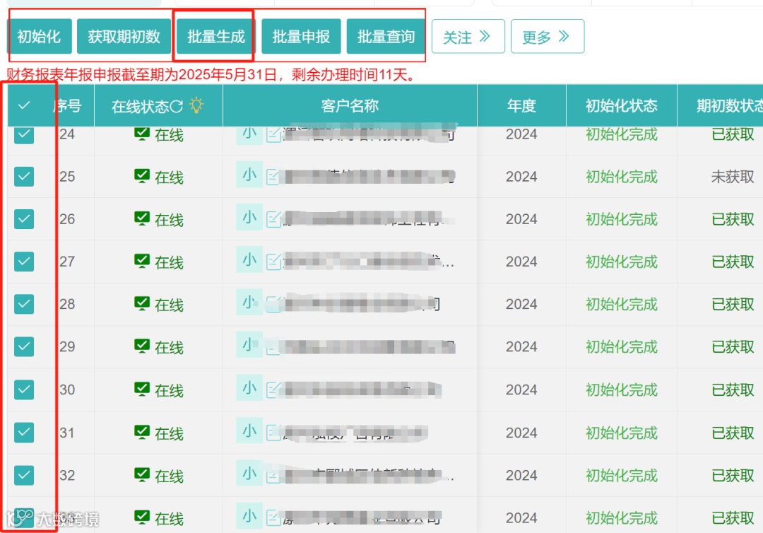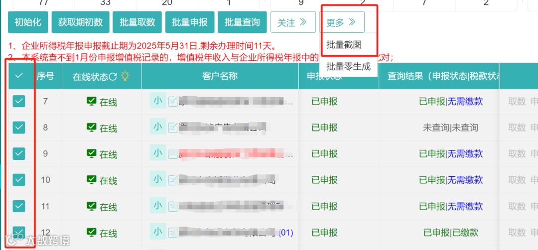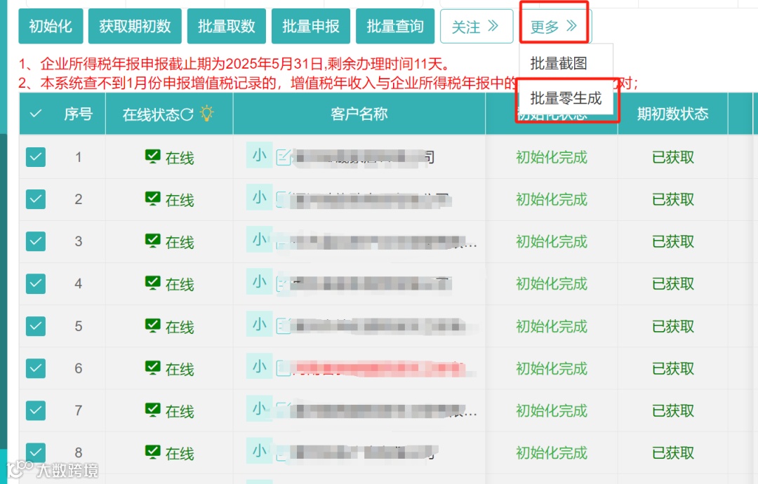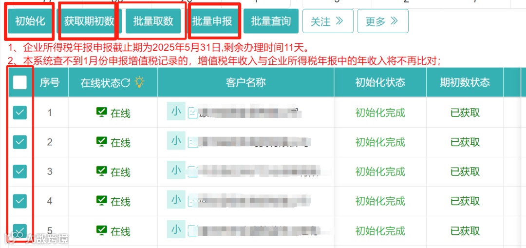 1.勾选需要申报的企业,先点击初始化、再获取期初数、接着依次点击批量取数、批量申报按钮;