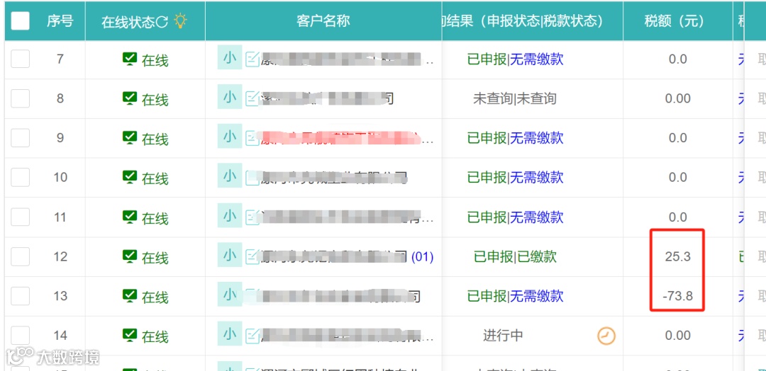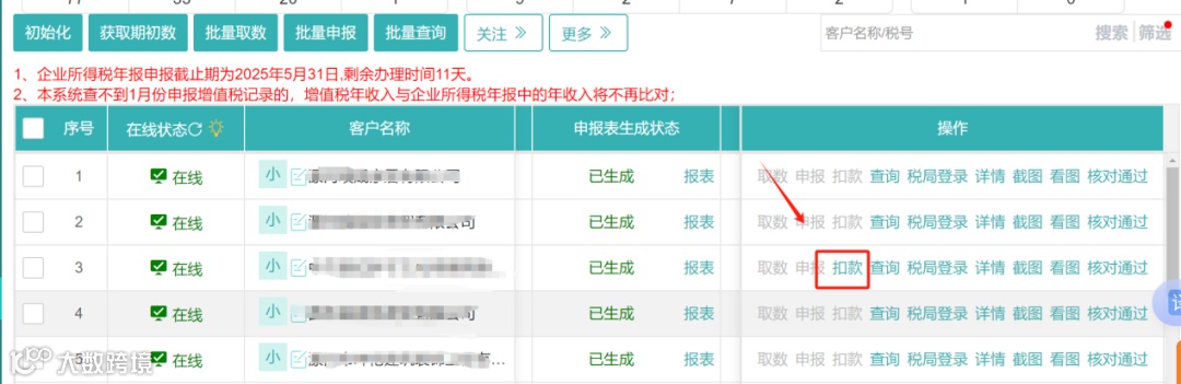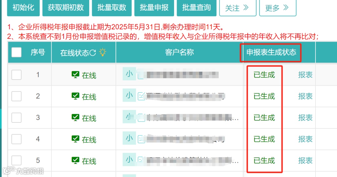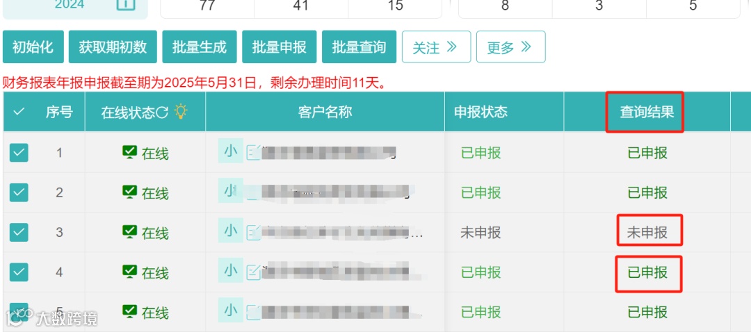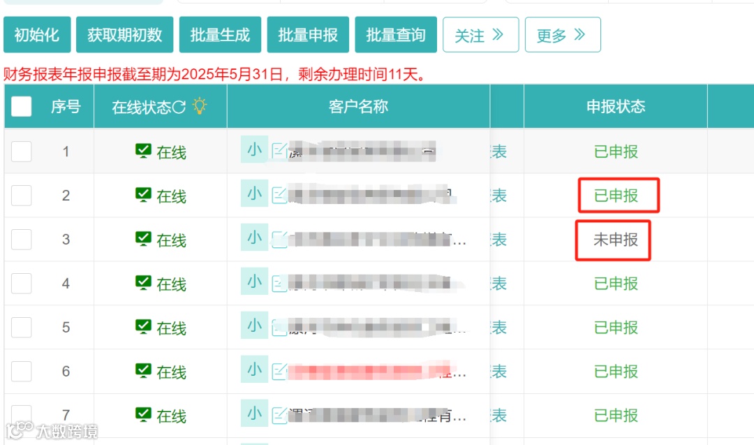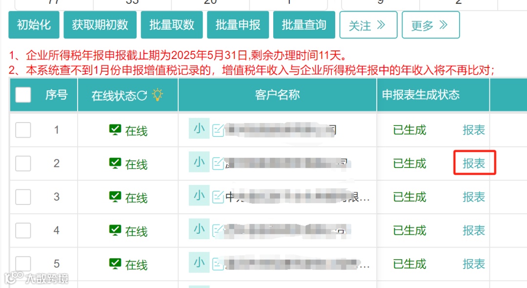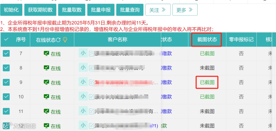 1.勾选需要申报的企业,先点击初始化、再获取期初数、接着依次点击批量取数、批量申报按钮;