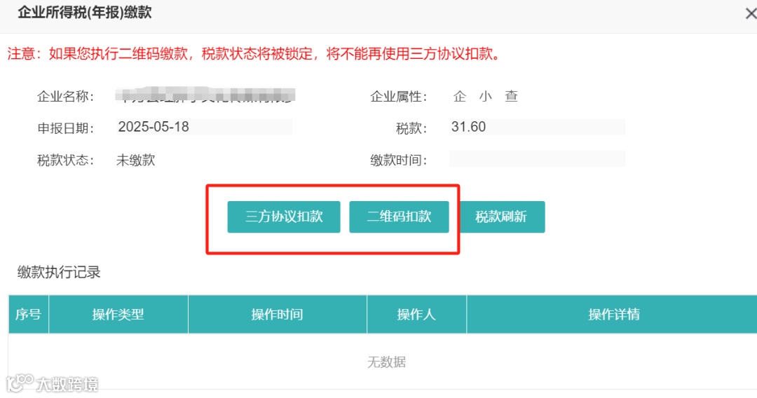 1.若存在应补税款,系统将在操作栏显示【扣款】按钮,支持通过“三方协议”或“扫码扣款”方式进行缴款;