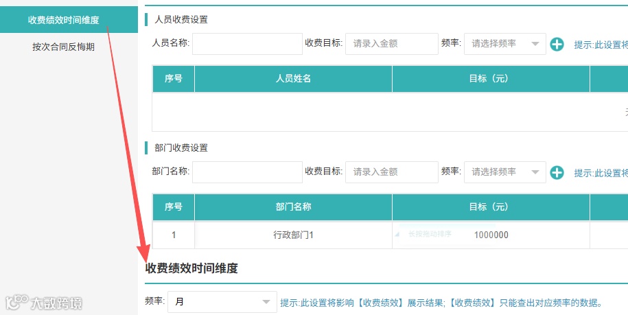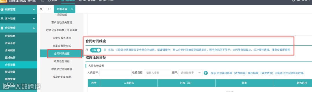 2.点击【合同设置】,就能看到「时间维度」「收费目标」「绩效维度」三大功能;