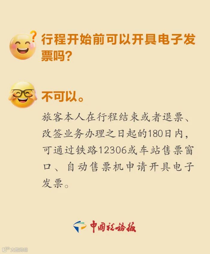 10月1日起,全国铁路旅客运输领域将全面使用电子发票(铁路电子客票),不再提供纸质报销凭证!我们整理了一些与电子发票开具相关的热点问题,一起来看↓