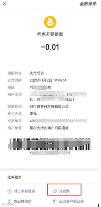 1.进入微信支付账单详情页,点击“开发票”