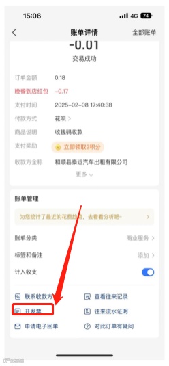 1.进入支付宝账单详情页,点击“开发票”