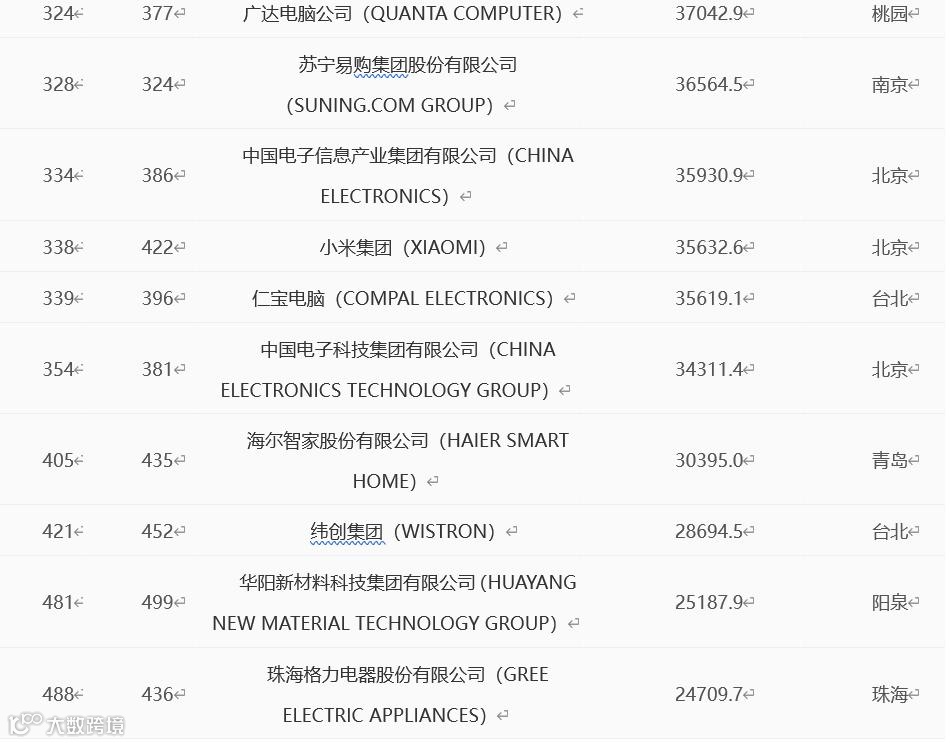 华为、京东集团、阿里巴巴集团、腾讯控股有限公司和小米集团、联想集团和苏宁易购。它们分别排名第