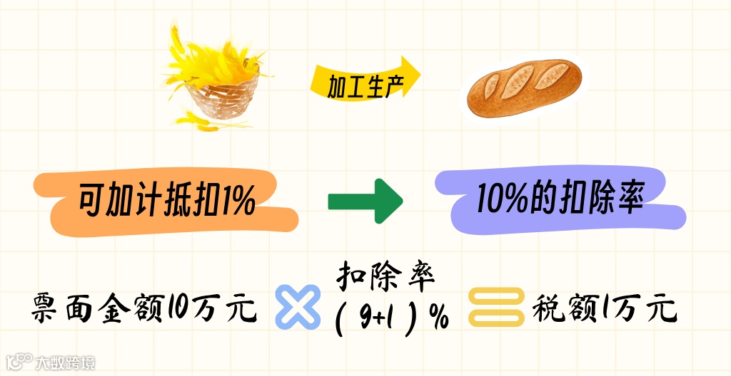 例如,上述食品加工厂将购进的小麦用于生产面包(适用税率13%),取得增值税专用发票,票面金额10万元,税率9%,在购入当期企业可抵扣进项税额为0.9万元,在生产领用当期,再加计抵扣0.1万元。