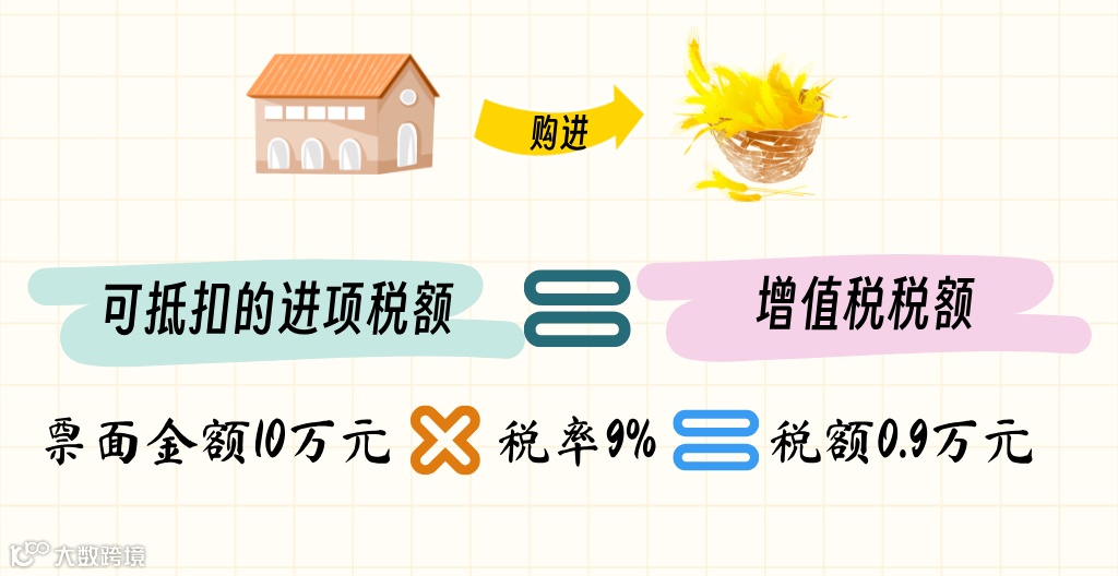 例如,某食品加工厂从一般纳税人处购进小麦用于生产面粉(适用税率9%),取得增值税专用发票,票面金额10万元,税率9%,增值税税额0.9万元,那么该企业可抵扣的进项税额就是0.9万元。