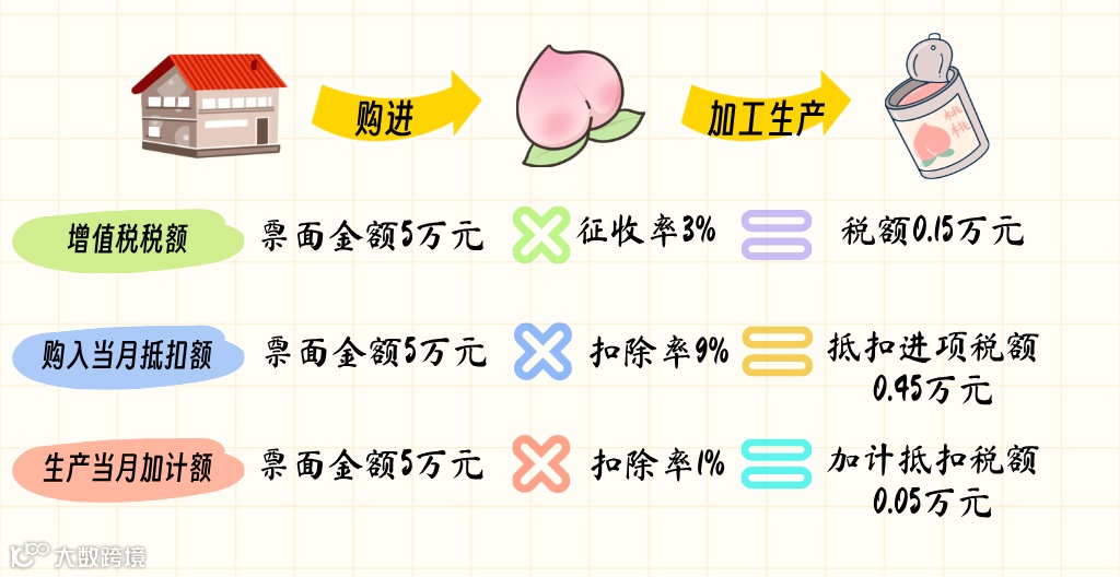 比如,某饮料厂从小规模纳税人处购进水果用于生产水果罐头(适用税率13%),取得增值税专用发票,票面金额5万元,征收率3%,税额0.15 万元,在购入当月,企业可抵扣进项税额0.45万元,在生产领用当月,再加计抵扣0.05万元。