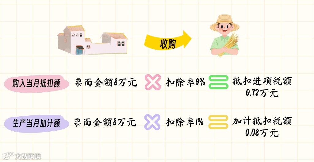 例如,某糕点厂从农民手中收购一批糯米,开具的农产品收购发票上注明买价8万元,在购入当月,企业可抵扣进项税额0.72万元,在生产领用当期,再加计抵扣0.08万元。