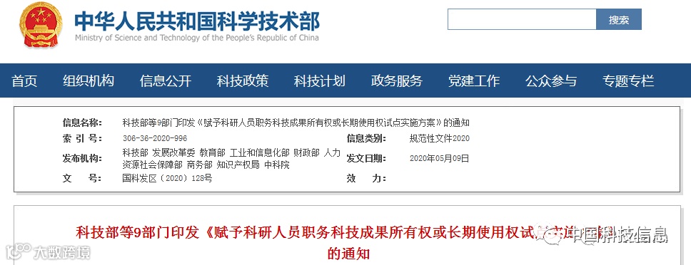 科技部等9部门印发《赋予科研人员职务科技成果所有权或长期使用权试点实施方案》的通知