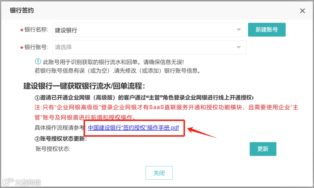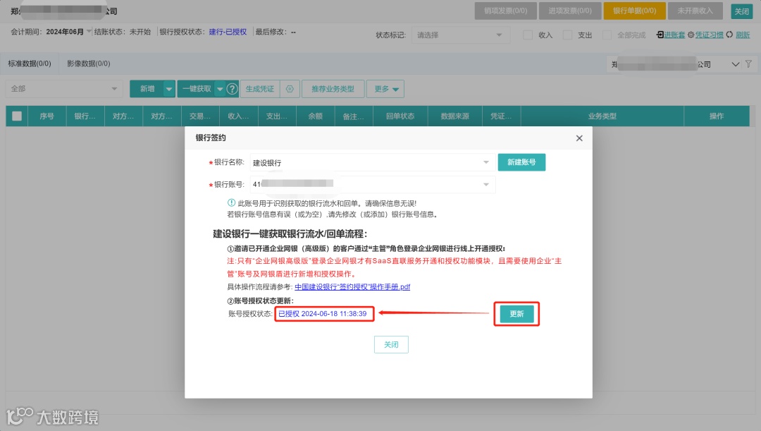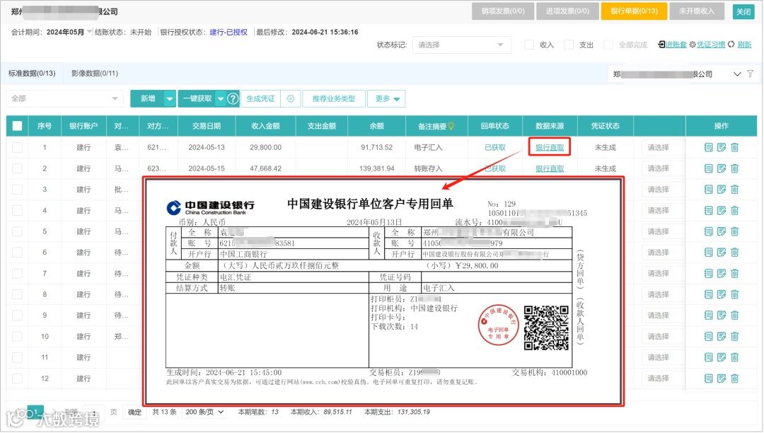 慧代账对接中国建设银行SaaS直联服务,企业授权后即可一键获取银行流水/回单。快来了解一下吧!
