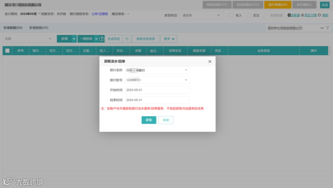 授权状态为“已授权”企业则可“一键获取”对应月份全部银行流水及回单。