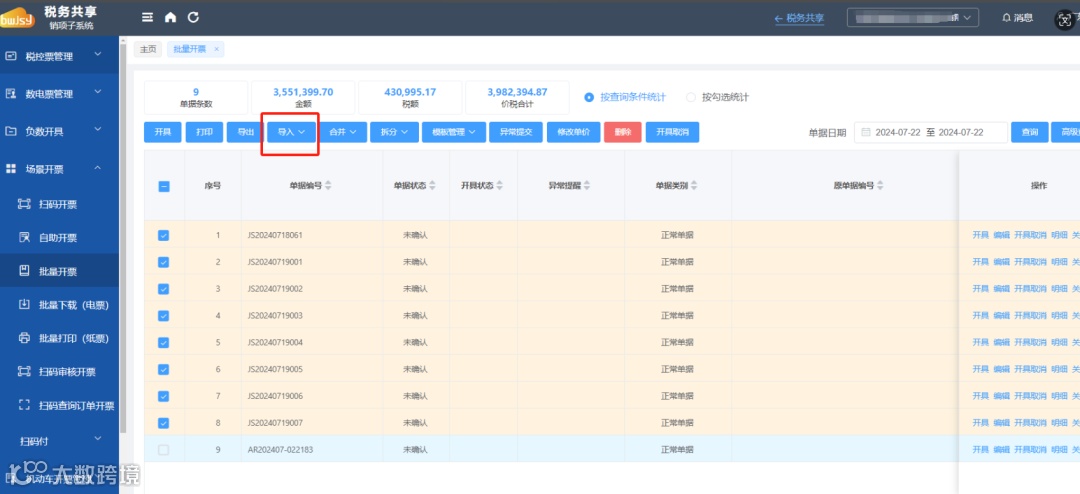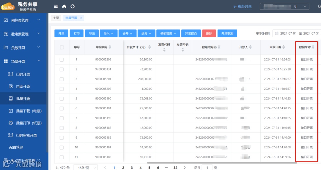 百旺金穗云销项SaaS根据发送的开票信息,或者导入的开票信息,按购买方、税号、VIN、业务单号、日期等多种条件进行清单选择开具发票并打印,系统支持发票清单一次导入一个待开票单据,也可以一次导入多个待开票单据,然后进行单据的拆分、合并处理,再批量开票,支持按含税价格、按不含税价格导入两种方式,也支持成品油类型的数据导入。