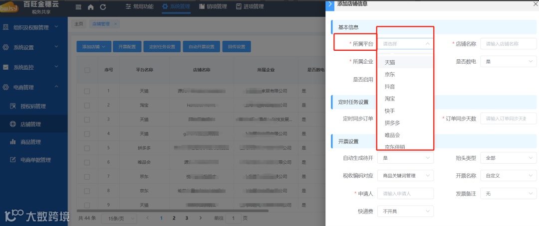百旺金穗云销项SaaS支持电商对接开票,支持多个平台的订单获取,如:天猫、京东、抖音、淘宝、快手、拼多多、唯品会、京东快销等,可实现订单自动同步,实现自动开票或审核开票,发票开具完成,自动回传电商平台。