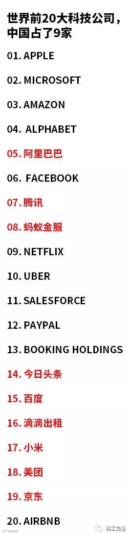 而在全球最大的20个科技公司中,中国已经拥有9家,其中3家进入了前十名,包括阿里巴巴、腾讯和蚂蚁金服。