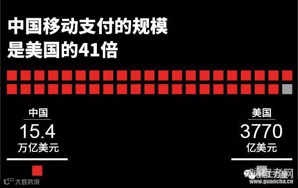 2011年,支付宝推出二维码支付,一年之后,微信快速跟进推出微信支付。目前中国移动支付市场的规模15.4万亿美元,是美国市场的40多倍。而且移动支付技术也快速推动线上线下服务,消费者可以在需要消费需求的瞬间订购外卖、狗狗美容师等上门服务。